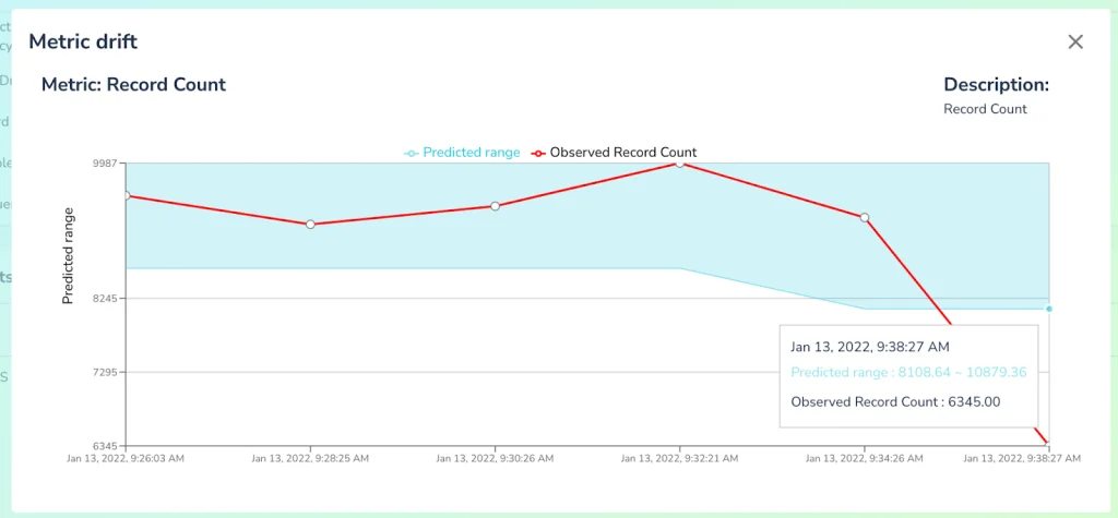 We can notice that one of the alerts was for a drift in Record Count, so it would be helpful to understand what was the historic trend and prediction based on that trend and what was the observed value: