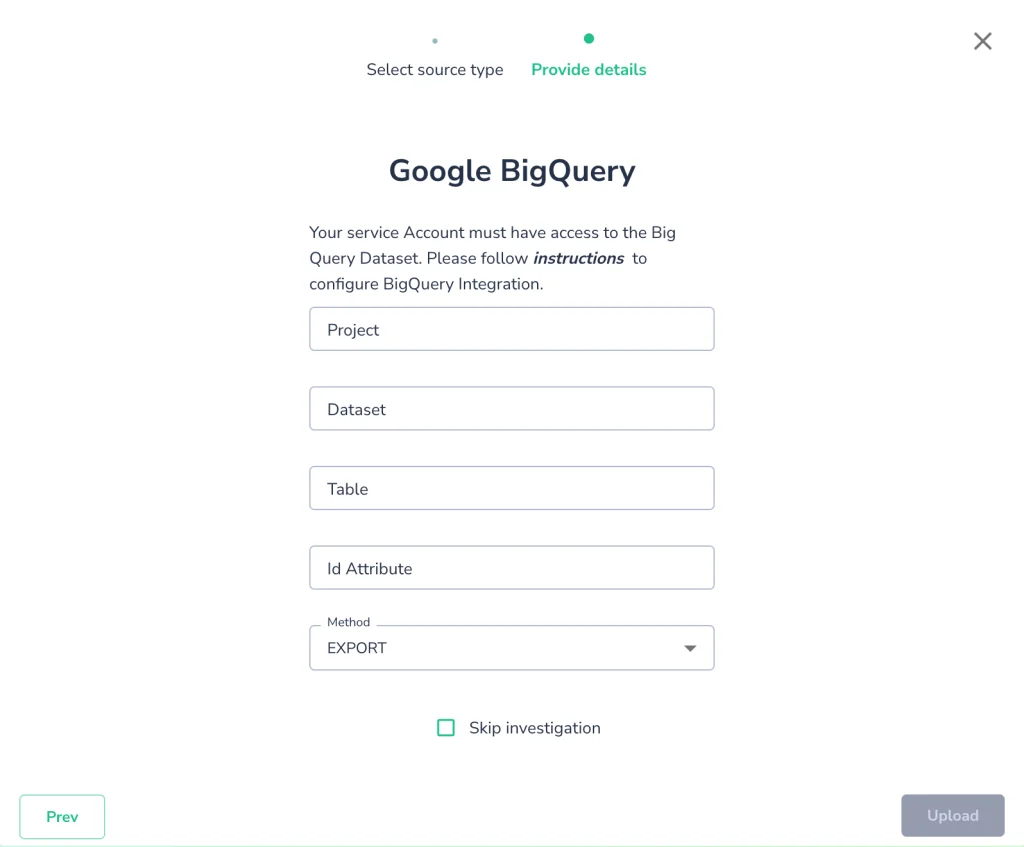 For example, let’s connect to a BigQuery View. All it needs is the dataset name, table/view name and optional Id Attribute, if you have one, so Telmai can track the number of duplicate records: