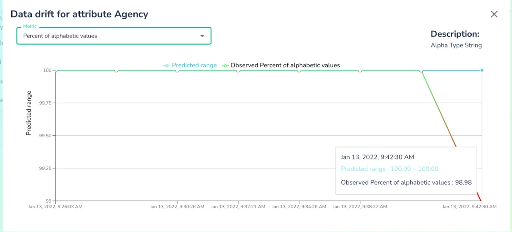 Similarly with other types of drifts, Telmai can register a wide variety of anomalies and present them to users. Below we see that in the Agency attribute there were 4 different observations of drifts detected: unexpected drop in ratios of alphabetic values, jump in numeric values, as well as increase in mean number of tokens and special characters. All of these are signs of bad data influx.