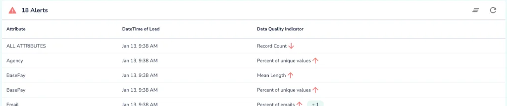 In this instance there is a particularly bad batch, happened at 9:38AM on Jan 13. There are 18 alerts total across all attributes due to various drifts, including significant dip in volume of the data observed.