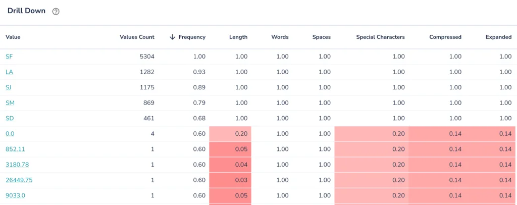 In this picture we see each value get’s scored on number of aspects. The lower the score (highlighted in red) the more anomalous the value is. Sorting data by various anomality aspects greatly helps in identifying blind spots in the data.