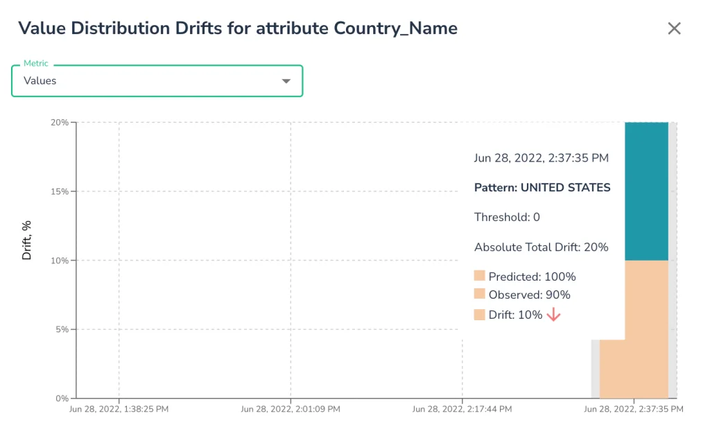 In addition to various data metric drifts like record count, completeness etc., Telmai can automatically detect unexpected changes in distributions of categorical data or changes in the distributions of value patterns: