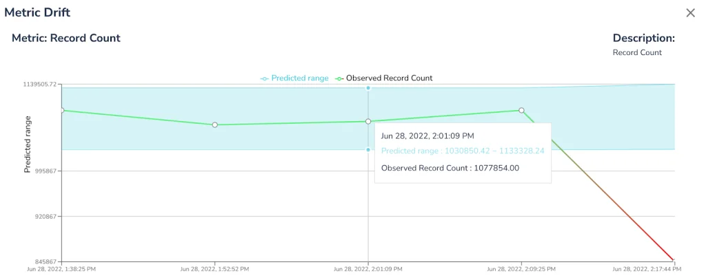 Telmai will automatically establish and predict trends over key metrics, like % of non-null/empty values, number of records, % of unique values and many more. When an observed value of a metric is outside of prediction boundaries Telmai will issue an alert and send a notification to subscribers.